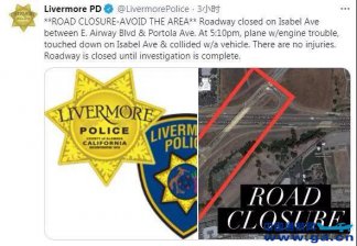 美国加州一架飞机紧急迫降时撞上汽车 幸无人员伤亡