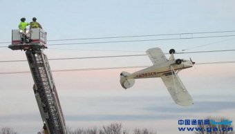 美国明州一架单螺旋机飞机倒挂电线上 所幸飞行员获救 无人伤亡