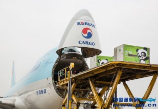 "熊猫夫妇"搭乘大韩航空B747F专机抵韩
