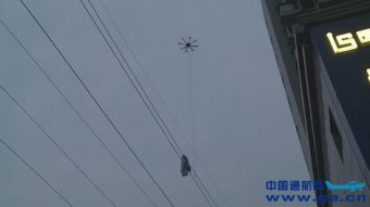 住户晾晒被子被风刮至高压线上 无人机紧急除险