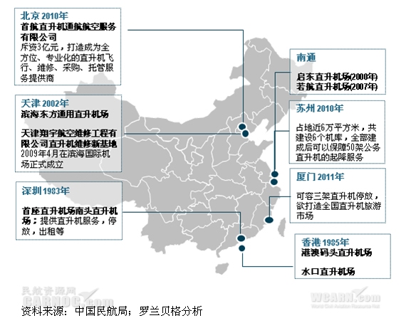 价值链方面,因为中国飞机制造的配套软环境还没有完全建立起来,因此一些关键的零部件制造,虽然借助政策和资本的力量不是没有机会引入国内,但是即使引入了,可能也会面对“橘生淮北则为枳”的尴尬处境,倒是围绕基础环境的打造(吸引国外制造商和合作机会)以及购机流程优化方面的一些尝试可能会收到较好的效果,总之就是要在市场发展到什么阶段引入什么样的业务,超前和滞后都不是太可取。除此之外,虽然国内直升机市场尚未成熟,但不能否认的是市场上已经有一些企业和个人出于各种原因购置了直升机,而这类客户会有直升机托管的需求,因此这部分业务也是值得短期关注的一个点,代表性的企业如南航珠直。在有就是针对二三线机场,围绕直升机的通航基地运营在未来会出现新的机会,但当前阶段的布局最好能找到专业机构进行合作,培育市场、分散风险,同时积累通航运营经验,待机会到来时,可以迅速把握住,个人觉得汕头机场、温州机场、大连机场、三亚机场、昆明机场等在这方面有潜力,但是否真的适合、何时进入,以及如何构建,那就要需要系统扫描过后再做定论了。 图3:中国直升机基地一览(部分)