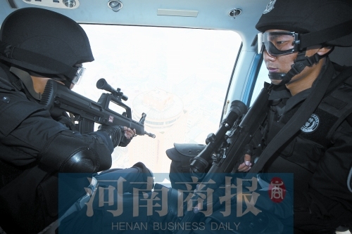 图:特警跟机空中巡逻,郑州安全又多了一重保障 郑州警方“铁网”行动又有新动作—特警队员全副武装随直升机空中巡逻。遇到暴力恐怖犯罪目标,特警狙击手可精准打击。