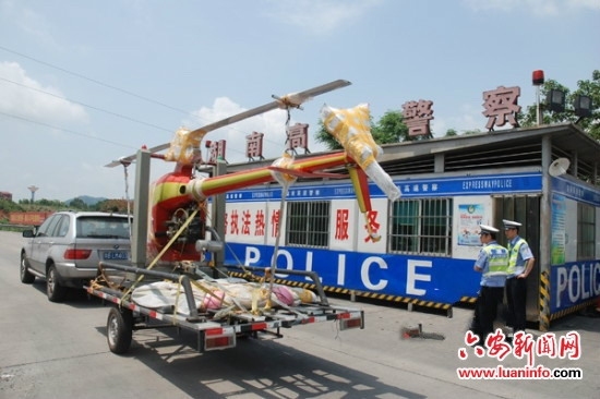 8月19日下午16时许,六安市公安局交警支队高速四大队接到群众报警,称济广高速公路上有一辆小轿车牵引一架小型飞机,正在高速公路上快速行驶。