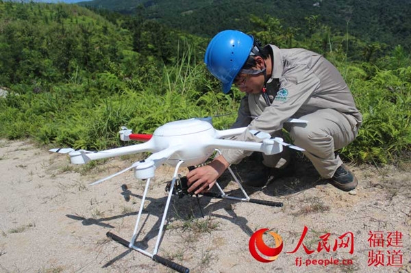 图:电力检修人员对无人机进行调试