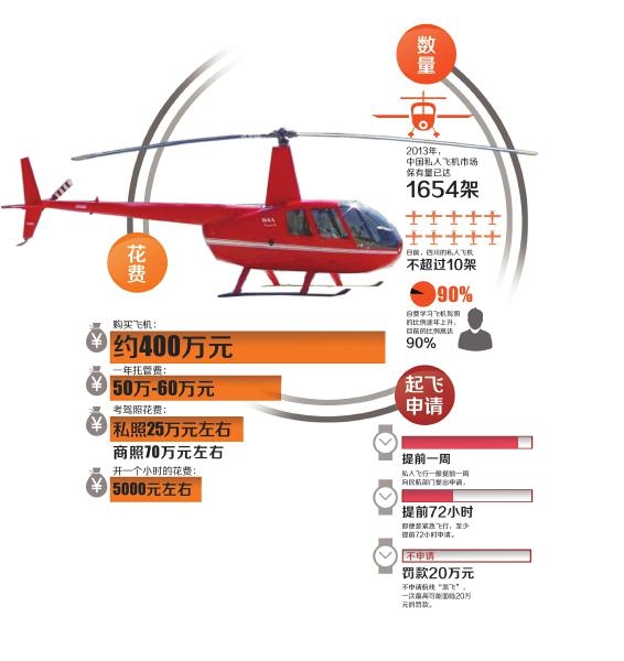 “购买飞机只是个人爱好。”赖先生接受记者采访时说,购买这架飞机的花费约400万元左右,从2014年2月预订飞机到正式交付,耗时半年时间,所有的手续都交由通航公司办理,包括交付后的托管、航线申请、保养和维修。赖先生说,开飞机与开车完全不一样,汽车只有前进挡和倒车挡,但是飞机有前后左右四个方向,几乎全靠手上的操作,没有任何捷径。在所有的学习过程中,悬停最难,只要悬停会了,离拿到私照就不远了。而现在他“只会在天上飞,起飞和降落还不行,因此都有专业驾驶员陪着飞。”