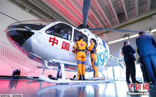 当地时间2014年10月9日,德国多瑙沃尔特,双引擎EC135空客直升机被移交给中国,这将是中国首架设备齐全的空中救护车。