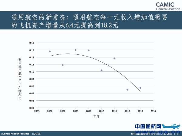 三、商务航空已进入“新常态” 包括商务航空在内的我国通用航空已经进入新常态: 根据中国民航管理干部学院通用航空系的研究发现,从2007年到2013年,我国每一元通用航空收入增长,需要的资本形成(新增飞机购买成本),已经从6.4元快速增长到18.2元。 目前我国公务机平均的年利用率低于150小时,仅为全球平均水平的一半。公务机行业与通用航空其它领域一样,应该从粗放的产能投入转向提高经营效率的集约化发展方式转变。