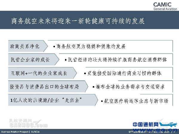 五、商务航空将迎来新一轮健康可持续的发展 商务航空领域“洗洗更健康”。“十八大”以来,随着政商关系逐步净化,商务航空将在“十三五”期间迎来新一轮更为稳健和健康的发展。 在我国,民营经济已占据国民经济产值的半壁江山。随着中国经济保持中高速发展,迈向中高端水平,以及“大众创业”、“万众创新”的两创社会的形成,民营经济还将迎来快速发展浪潮,民营企业家的成长将进一步拓展商务航空的消费群体。马云1999年创业的时候还是个爱吹牛皮的小老板,可是当他坐公务机到华尔街圈回两千亿美元时,这中间仅仅用了十五年,要充分认识到我国经济形态的快速变迁对商务航空的潜在推动。 我国互联网+一代的企业家更能接受国际通行商业习惯,公务机更可能成为新技术富豪们的标配。 随着亚投行的成立、我国“一路一带”建设,我国将从纯粹的消费品出口大国转变为投资品与消费品共同出口的大国,随着我国资本的走出去,商务航空将从以往局限在中国和美欧出口市场之间飞行,更多地走向亚洲、非洲、南美洲。 此外,我国每年1亿人次的出境游和企业海外扩展,国际旅行者和政府、企业外派人员普遍购买航空医疗保险,将为公务机运营企业带来航空医疗转运等新业态、新市场。 中国商务航空一定会随着中国经济影响力的扩大,不断走向全球每一个角落,中国商务航空前景广阔。