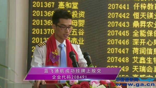 图:十年磨一剑,蓝飞通航于上海股权托管交易中心成功挂牌上市。 2015年12月27日,北京蓝天飞行通用航空科技有限公司成功挂牌上市,股票简称:蓝飞通航,股票代码:208491。并在上海股权托管交易中心举行了隆重的敲钟仪式。
