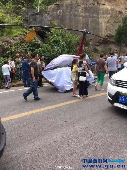 图:重庆石柱黄水一直升机坠落。 据重庆晚报官方微博消息,今日(25日)下午,重庆石柱黄水一架罗宾逊R44直升机超低空飞行时发生意外,直接坠落在当地一条公路上。机上人员1人受伤。目前,伤者暂无生命危险。 据了解,出事的飞机属于山东齐翔通航,这次来石柱黄水,是进行旅游观光试飞。事发时,出事的飞机正在进行试飞。万幸的是,出事时飞行高度不高。目前,当地公安、安监、120、旅游等部门赶往现场施救并调查事故原因。
