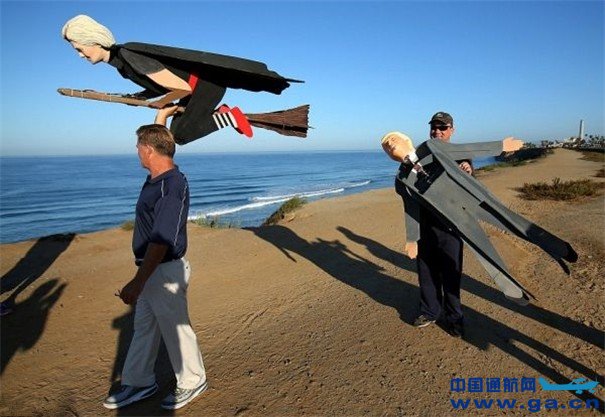 ▲ 希拉里饶有兴趣地将无人机捧在手上仔细端详/图 来源网络 ● 今年9月,据《每日邮报》报道,发明家迪芬巴赫(Otto Dieffenbach)分别以希拉里和川普为造型制造了两架真人大小的无人机。川普造型的无人机飞上高空后身后洒下大把钞票,预示着他雄厚的财力。而希拉里身着女巫的斗篷坐在一把飞天扫帚上。