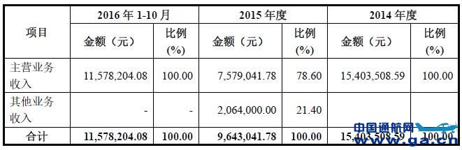 高翔通航公开转让说明书显示,2016年1-10月、2015年、2014年公司营业收入分别为1540.35万元、964.30万元、1157.82万元;净利润分别为667.66万元、-187.96万元、171.78万元。