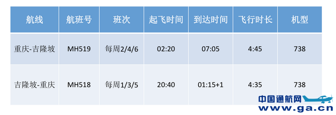 自2017年10月31日起,马来西亚航空将开通每周3班由重庆直飞吉隆坡的定期航班,为中国西南地区的旅客提供更多飞往马来西亚的航班选择。重庆继北京、上海、广州、厦门、海口、南京、福州和武汉之后,成为了马来西亚航空在中国开设的第九个通航城市。 重庆—吉隆坡新航线信息如下: