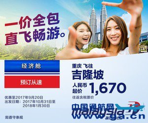 中国通航网 www.ga.cn 通航翻译 www.aviation.cn 本文链接地址:重庆—吉隆坡航线开航在即 马航特推出往返1670元优惠机票 |