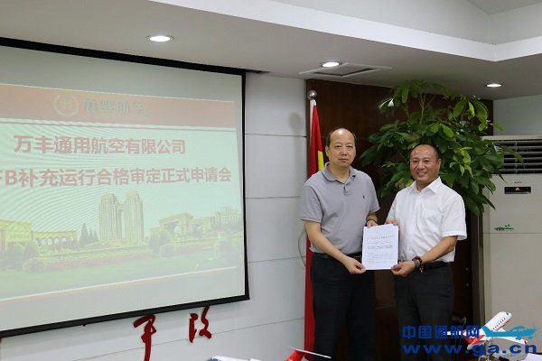 图:万丰航空总经理张景礼将正式申请信及附件交给民航浙江监管局朱承辉副局长。