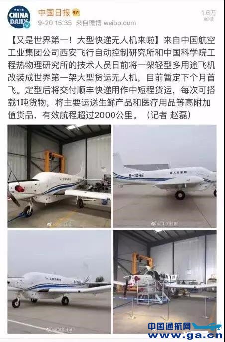 由中国航空工业集团公司西安飞行自动控制研究所和中国科学院工程热物理研究所共同研制的世界首架大型货运无人机将于下个月首飞。飞机定型后将交付顺丰快递用作中短程货运,每次可搭载1吨货物,将主要运送生鲜产品和医疗用品等高附加值货品,有效航程超过2000公里。