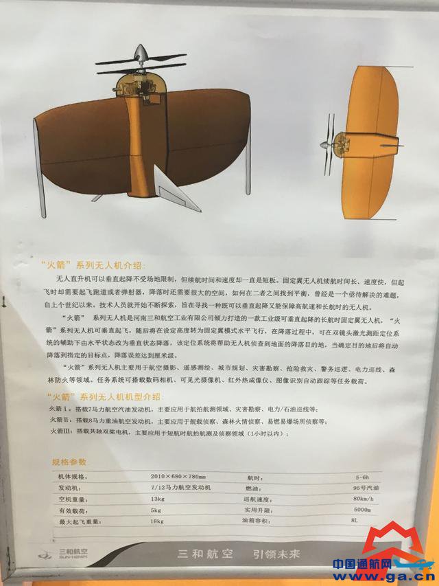 “火箭”系列无人机是河南三和航空工业有限公司打造的一款工业级可垂直起降的长航时固定翼无人机。据介绍,该型无人机可垂直起飞,随后将在设定高度转为固定翼模式水平飞行,在降落过程中,可在双镜头激光测距定位系统的辅助下由水平状态改为垂直状态降落。