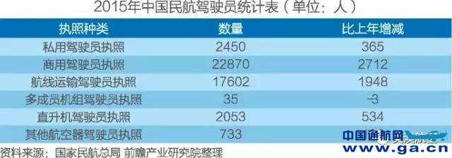 2015年,我国通用航空从业人员数量为14500人,其中飞行专业人员7900人,从业通用航空飞行员数量2850人,其中中国籍飞行员2043人,外籍飞行员148人。截至2015年底,全行业取得驾驶执照飞行员45523人,较上年年底增加5642人。预计未来10年我国对通用航空飞行员的需求量将超过50000人。到2025年,我国飞行员缺口将高达25000名。