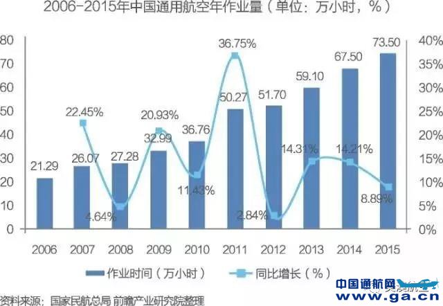 ![]() 2. 中国通用航空业生产作业状况分析 通用航空业作业量分析 1、通用航空作业时间分析 2014年,全行业完成通用航空生产作业飞行67.50万小时,比上年增长14.21%。2015年,全行业完成通用航空生产作业飞行73.50万小时,比上年增长8.89%。作业时间量排在前三位的通用航空项目分别为石油服务、防治病虫害、电力作业。