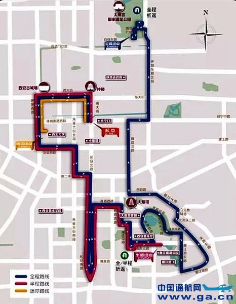 南门外广场(起点)→南大街→钟楼→西大街→安定门→环城西路→太白北路→友谊西路→朱雀大街→南二环(辅道)→长安中路→长安南路→电视塔盘道(折返)→长安南路→雁塔西路→慈恩西路→慈恩路→雁塔南路→雁南三路→芙蓉西路→芙蓉东路→北池头一路→芙蓉南路→曲江池东路→曲江池南路→芙蓉东路→北池头二路→曲江路→西影路→雁塔北路→环城南路(辅道)→环城东路→太华南路→大明宫国家遗址公园御道广场(终点)。