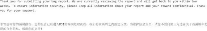 根据威胁的潜在影响,大疆对确认缺陷的奖励从100美元到3万美元不等。而据国外媒体披露,DJI正在开发一个网站,提供完整的程序条款和标准格式,用于报告与DJI的服务器、应用程序或硬件有关的潜在威胁。而目前bug报告可以发送到bugbounty@dji.com,供技术专家审阅。