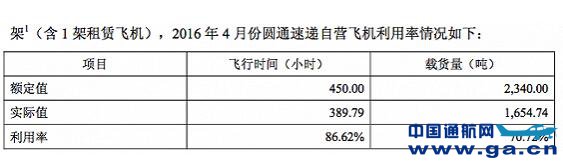 在圆通的招股书中,航空件的单件运输成本在2-2.5元之间。知情业内人士对界面记者表示,实际的成本远远高于这个数字。 航空运输成本取决于飞机的利用率,影响因素有起飞架次、航线距离、载重量等。截止去年发布招股书时,圆通公布有四条定期航线:杭州-北京/成都/西安、深圳-成都,四条航线飞行时间均为两小时上下。招股书显示,2016年4月自营飞机3架(1架租赁)的利用率情况如下: