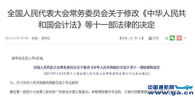 对《中华人民共和国民用航空法》作出修改 删去第一百四十七条第二款中的“并依法办理工商登记;未取得经营许可证的,工商行政管理部门不得办理工商登记”。 本决定自2017年11月5日起施行。 中国通航网 www.ga.cn 通航翻译 www.aviation.cn 本文链接地址:全国人大修改民航法,取消通用航空前置审批 |
