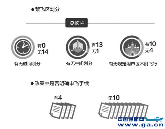 ![]() 禁飞区划分方面,14份文件中都有相关规定。从时间上看,14份文件中均未对夜晚等危险多发时段的飞行进行特殊规定;从空间上看,有13份文件对禁飞区域有详细的规定,10份文件规定了闹市区(人口密集区域)不得飞行。