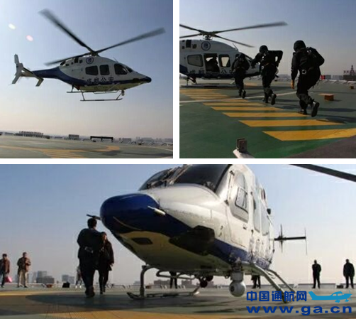 伴随着隆隆的轰鸣声,直升飞机在目标上空盘旋了几圈后徐徐降落在港泰·通航大厦顶楼停机坪上。飞速转动的螺旋桨,制造出一阵大风。三名全身黑衣、头戴钢盔的特警,全副武装直升机上鱼跃而出,瞬间集结到位,持枪有序前行……