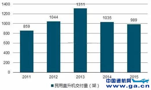 近年受到能源、货币、政治问题等因素的影响,全球直升机的交付量略有下跌。特别是 2014 年受石油价格下跌的影响,民用直升机的交付量猛降,不过近两年民用直升机的年交付量都稳定在 1000 架左右。