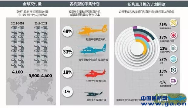 2017 年 4 月 11 日,在上海虹桥机场举办的亚洲商务航空会议和展览会(ABACE,又称亚洲公务机展)期间,霍尼韦尔航空航天集团发布第 19 期涡轮动力民用直升机采购展望报告中文版,其中预测 2017-2021 年期间全球民用直升机交付量将达3900 至 4400 架,与 2016 年的五年期预测相比减少约 400 架。 在购买意向中, 轻型单发直升机占据了 48%,其次是轻中型和中型双发直升机,占 33%。