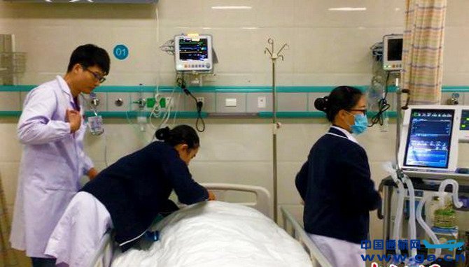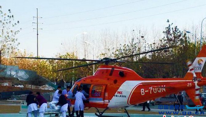 中新网合肥12月18日电:18日伴随着轰鸣声,一架橙色医疗救援直升机平稳降落在停机坪上,两名医护人员迅速跳下飞机,与早已在附近等待的急诊科医护一起,将机内一名“重伤员”抬下机舱,平稳放置在推车上,紧急送往急诊抢救室。