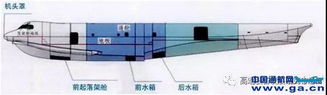 ![]() 在中机身地板下方布置有为灭火任务设计的前后水箱舱,还有主起落架连接装置、水箱、舷窗、顶部应急出口和8个投水舱门。中后机身设置有通舱后左舱门和右舱门,以及布置在机身两侧的主起落架轮舱等结构。