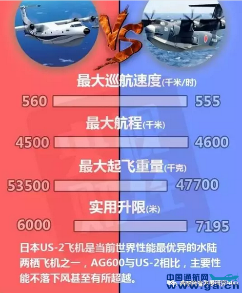 世界水陆两栖飞机的发展已经有接近100年的历史,而且仍然在不断革新。目前世界上投入使用的大型水陆两栖飞机大约有300多架。为了体现AG600所处的水平,以日本的US-2飞机进行对比: