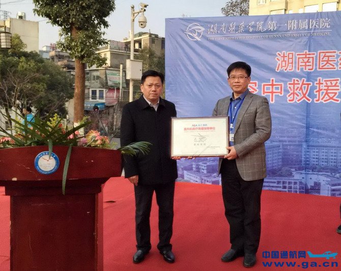 ![]() (金汇通航授予湖南医药学院第一附属医院《直升机医疗救援保障基地医院》牌匾)