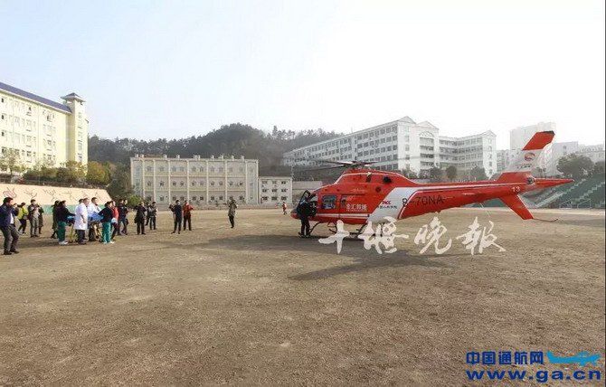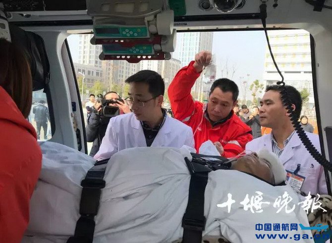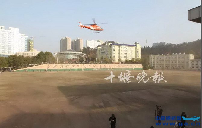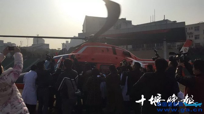 ![]() 鲁军体医生对熊富兴进行吸痰处理 ●下午15时06分 太和医院抢救转运床已到达指定位置,参与抢救的医护人员也时刻待命,等候病人的到来。 ![]() ●下午15时38分 直升机平稳降落在湖北医药学院的操场上,医护人员将熊富兴抬出机舱,转运到医院事先准备好的抢救运转床上,紧急送往医院中心ICU。