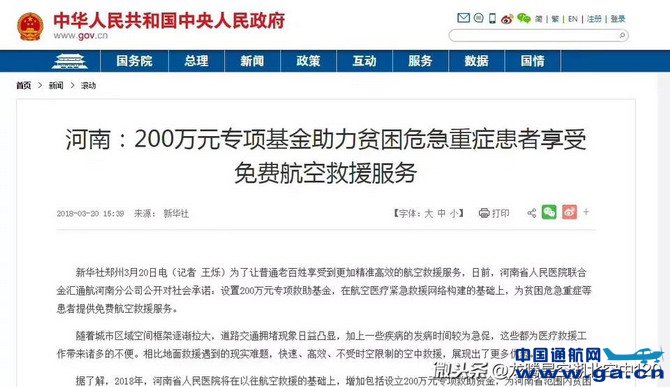 中国人民政府报道:为了普通老百姓享受到更加精准高效的航空救援服务,河南省人民医院联合金汇通航河南分公司公开对社会承诺:设置200万元专项救助基金,在航空医疗紧急救援网络构建的基础上,为贫困危急重症等患者提供免费航空救援服务。来源:龙腾星空湖北空中120 中国通航网 www.ga.cn 通航翻译 www.aviation.cn 本文链接地址:为普通百姓享受更精准高效航空救援服务 设置200万元专项救助基金 |