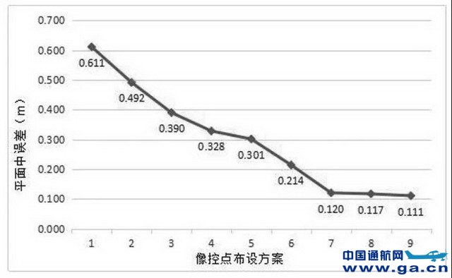 传统的摄影测量规范由航线跨度和基线跨度的形式布设像控点,需要布设140 个点左右,而方案九按照预设400 m 间距布设111 个像控点,其平面中误差为0. 11 m,由此可知,当像控点布设到140 个点时,平面精度也不会有较大提高,因此,不必严格按照传统空三的区域布点要求,可以根据具体情况,按照合适的间距布设像控点。