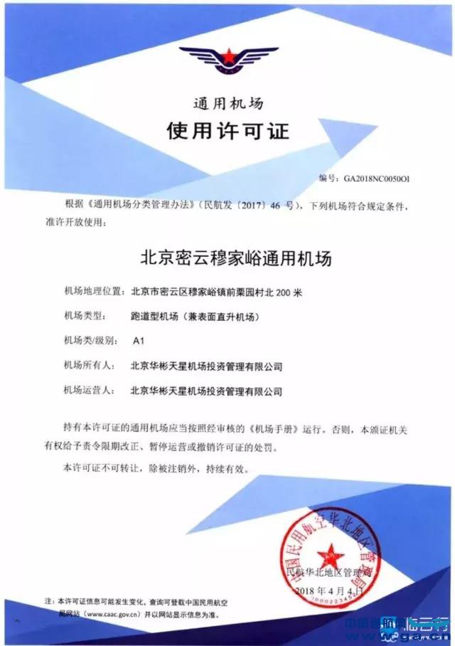![]() 临云行从华彬天星通航获悉,近日,华彬天星密云机场正式获得民航华北地区管理局颁发的通用机场使用许可证,成为新规下北京地区首批获取A1类通用机场使用许可证的通用航空机场。这标志着密云机场已符合民航局新规定下的规章标准,满足运营要求,准许开放使用。