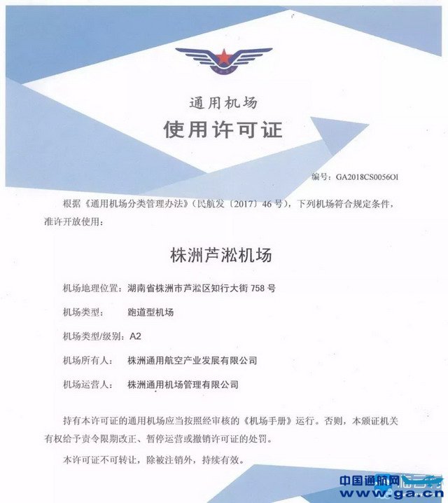 株洲芦淞通用机场获A类通用机场使用许可证