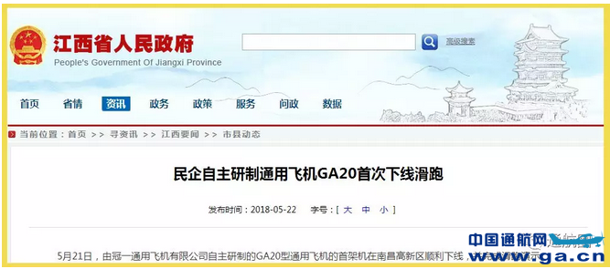 5月21日,由冠一通飞自主研制的单发4座固定翼飞机GA20的首架机在江西南昌高新区顺利下线并完成滑跑演示,意味着这架历时3年研发、拥有完整自主知识产权的“江西民企造”通用飞机从蓝图变为了现实。