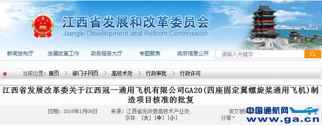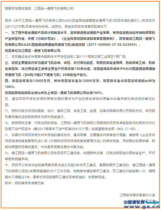 2018年1月5日,江西省发展改革委印发了关于江西冠一通用飞机有限公司GA20(四座固定翼螺旋桨通用飞机)制造项目核准的批复。根据批复,该项目主要建设内容为建设飞机总装、试验、交付等功能区,购置机体钣金模具、机体部装工装、机体总装型架、动力预总装工装等主要生产开发设备130余台套。项目建成后形成年产GA20四座固定翼螺旋桨通用飞机(为6吨/9座以下通用飞机)60架的生产能力。项目总投资1.2亿元。