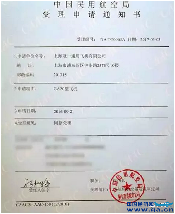 2017年3月3日,中国民航局正式受理GA20飞机型号合格证申请,这也是沈阳审定中心成立十年来首次受理民企自主研发的通用飞机型号TC申请。