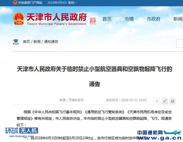 近日天津市人民政府官方网站上发布《天津市人民政府关于临时禁止小型航空器具和空飘物起降飞行的通告》。通告要求自2018年6月3日0时起至6月10日24时止,全市行政区域为临时空中限制区。 以下是通告原文: