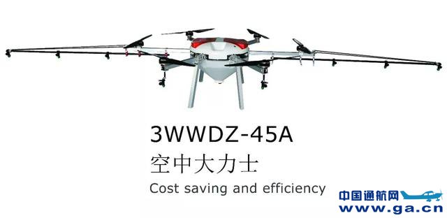 3WWDZ-45A是一款多功能农用无人机,最大作业载荷45kg药剂或颗粒粉剂。以六旋翼电动无人机为飞行平台,通过快速更换不同功能的挂载设备实现多种作业需求,如植保喷雾、辅助授粉、田间运输、农作物勘察、肥料播撒、种子播撒等。根据不同作物,还可自行调节喷洒流量,飞行速度,高度等。作业喷杆与整体支撑结构融为一体,喷头置于旋翼的下方,工作中螺旋桨的下洗气流可以很好的增加喷施药剂的穿透性,同时促使农作物摆动,叶片的正反面均可着药,提高施药效果。