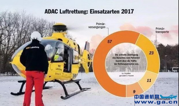 2017年,ADAC航空队共出动54491架次,有49000患者获得救助,飞行距离360万千米,相当于绕地球90圈。整个德国都具备了航空医疗服务能力,国土内任何一点在15分钟内可以得到航空救援服务。