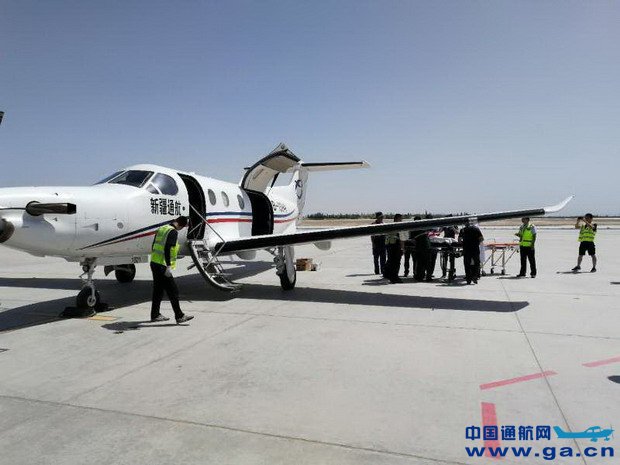 不到1小时的时间,新疆通航、且末机场完成起飞前准备,并将飞机内部座位进行拆卸调整,用以放置担架患者。13:13分新疆通航B-10HH飞机搭载着病患、家属及2名维吾尔族医护人员从且末机场起飞,1小时后飞机顺利抵达库尔勒机场。库尔勒市人民医院的救护车辆已在停机坪等待,按预定时间完成病患急救转运。