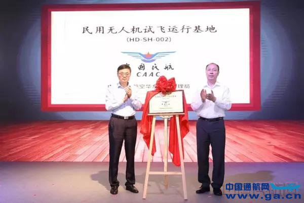 ![]() 民航华东地区管理局局长蒋怀宇(右)和金山区委书记赵卫星(左)为华东无人机基地揭牌