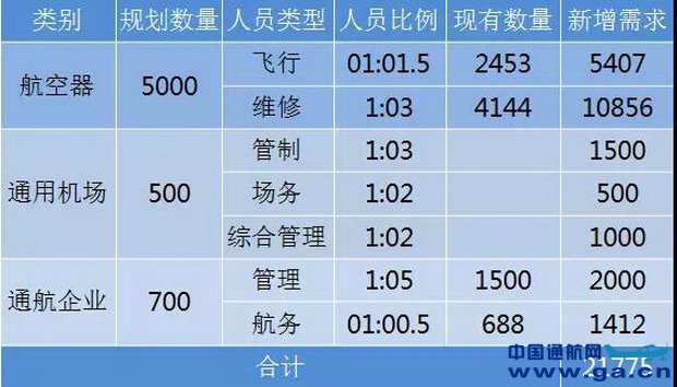 ![]() 通用航空从业人员按所从事工作可分为专业技术人员、综合管理人员与局方监管人员,专业技术人员又可细分为飞行人员、机务人员、航务人员。目前局方通用航空监管人员约60人,飞行人员3033人,维修人员4144人,航务人员688人,综合管理人员约5000人(其中高管约1500人)。 根据国务院办公厅《关于促进通用航空业发展的指导意见》、民航局《通用航空发展“十三五”规划》,到2020年我国通用航空器达到5000架以上、年飞行量200万小时以上、建成500个以上通用机场。尽管通用航空没有“人机比”硬性要求,但企业实际运营中,各类专业技术人员与机队、飞行量及机场数量之间存在客观的比例关系,可用于计算未来人才需求。 根据通用航空机队规模目标,按照通用航空器与飞行人员1:1.5、通用航空器与维修人员1:3的比例测算。根据通用机场的目标,按照每个机场配备3名管制人员、2名场务人员和2名综合管理人员的最低要求测算。按照200万飞行小时,预计将有超过700家通航企业,可按1:5计算高管人员需求,按1:3计算航务签派人员需求。计算结果如表1所示,到2020年我国通用航空将需要新增约2.2万名专业从业人员。