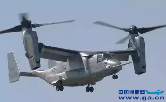 美国先后继续研制出XV-15,V-22等系列倾转旋翼机,其中V22在机翼两端各有一可变向的旋翼推进转置,各包含涡轮轴发动机及三桨叶组成的旋翼,整个推进装置可以在向上到向前之间转动变向,产生向上或向前的推力,分别用于直升机垂直起降或悬停以及固定翼飞行阶段。V-22“鱼鹰”倾转旋翼机是世界上第一种投入使用的倾转旋翼机,如图所示。